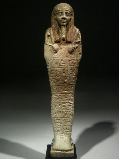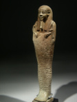 The shabti has nine horizontal lines of impressed hieroglyphs, containing spell 6 from the Book of the Dead, the so-called shabti-spell, and mentioning the titles and the name of the owner: the hereditary prince, count, royal scribe of all offerings and priest Tjai-iniheret-imu, born to Meriptah.