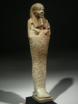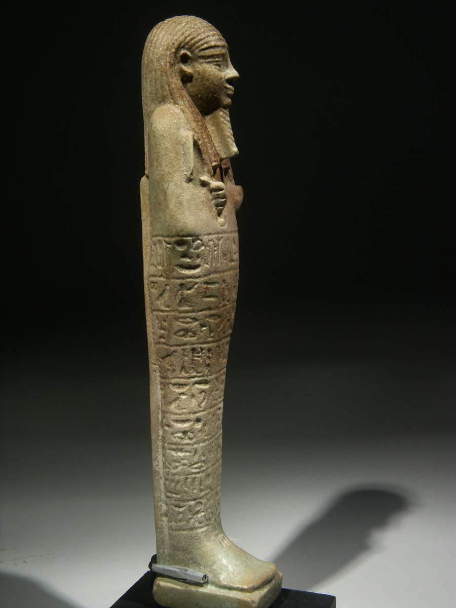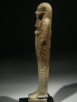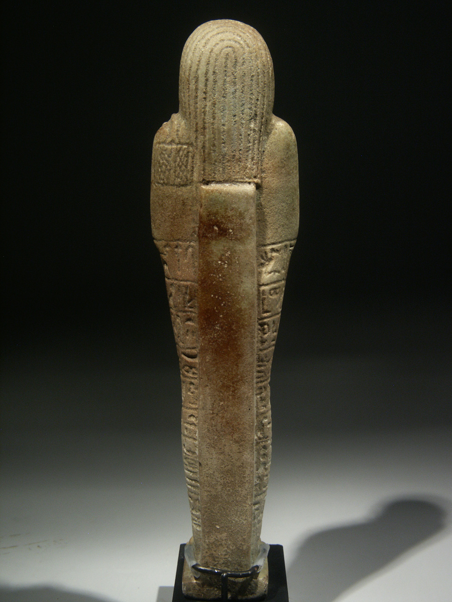 This is a sizeable shabti, made of Egyptian faience, for an important man called Tjai-iniheret-imu. The owner is depicted mummiform with only the head and arms protruding from the shroud. He has a plaited false beard and is wearing a striated tripartite wig, with two thick tresses in front of the shoulders, leaving the ears visible. The arms are crossed on the chest, the proper right arm over the left one, and the hands are holding the usual agricultural implements, a pick and a hoe, executed in relief. A seed bag is showing on the back, slung over the proper left shoulder. The shabti has a back pillar and plinth.