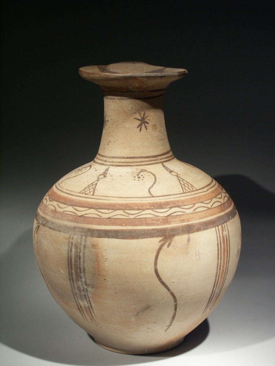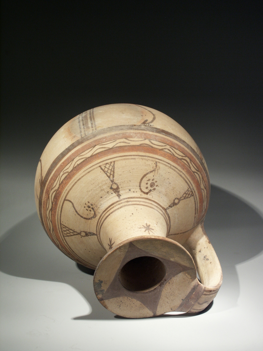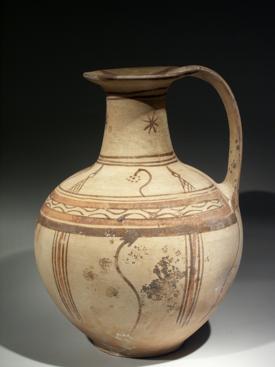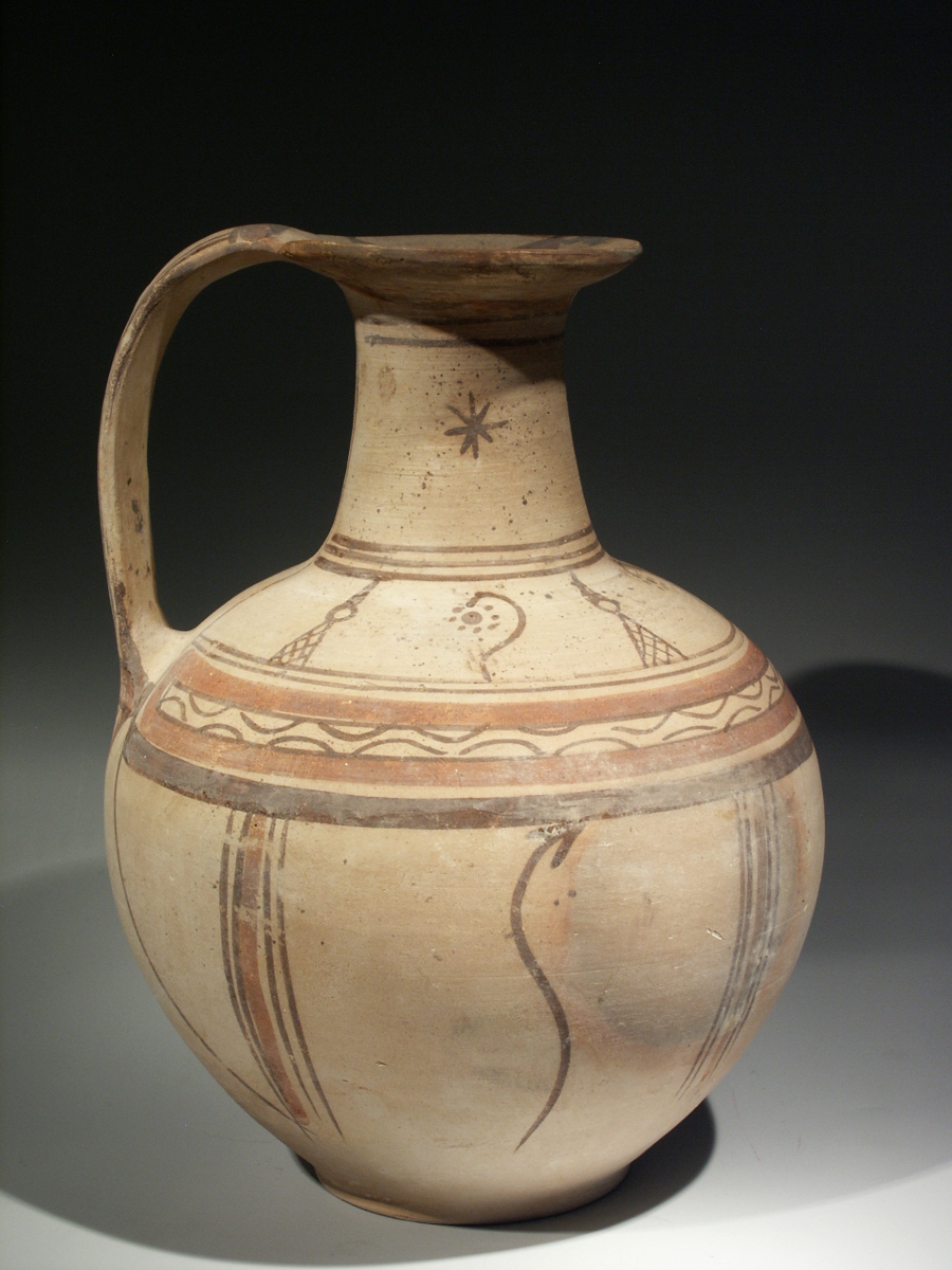 A beautiful bichrome clay vessel, dating to the 5th or 4th century B.C., and decorated in cream slip, dark brown and red matt glaze. The jug has horizontal bands of differing width and a wave band. Below this are bundles of vertical lines as well as S-shaped arrows. Above the horizontal bands, on the shoulder, is a frieze which contains blossoming tendrils and schematic human figures. The high neck is decorated with stars. The single handle shows wavy and straight lines. A magnificent vessel with wonderful colours.