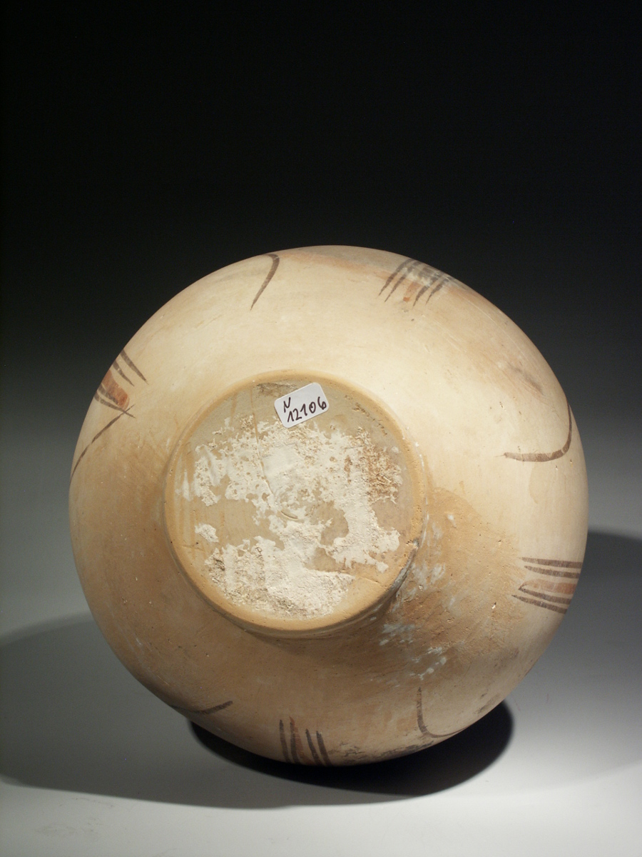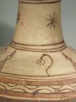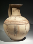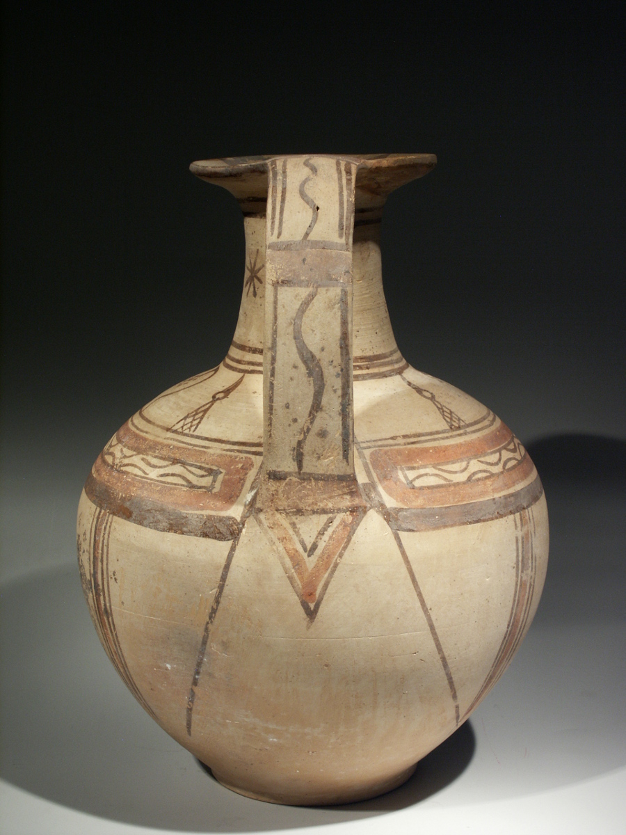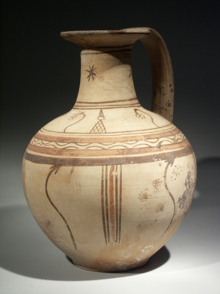 A beautiful bichrome clay vessel, dating to the 5th or 4th century B.C., and decorated in cream slip, dark brown and red matt glaze. The jug has horizontal bands of differing width and a wave band. Below this are bundles of vertical lines as well as S-shaped arrows. Above the horizontal bands, on the shoulder, is a frieze which contains blossoming tendrils and schematic human figures. The high neck is decorated with stars. The single handle shows wavy and straight lines. A magnificent vessel with wonderful colours.